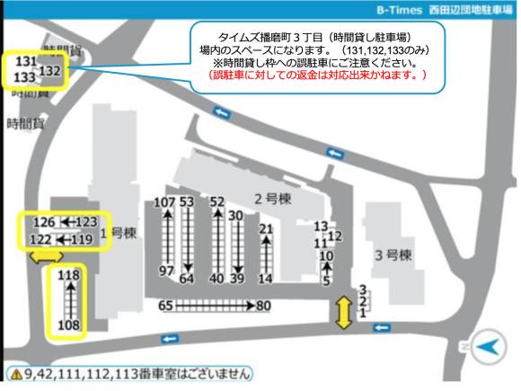 ■現地に到着した際は、必ずタイムズのBの写真や配置図をご確認の上、駐車してください。間違って他の利用者の場所に駐車しないよう、お気を付けください。 <ご予約した区画に不正車両が止まっていた場合> 下記をご参照の上、空き車室の照会・振替および不正駐車情報のご入力をお願いいたします。 https://btimes.jp/guide/rent_illegalpark.html |