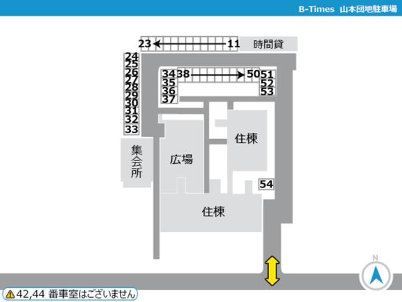 ■団地内に一方通行がある場合は必ず守って走行してください。 ■現地に到着した際は、必ずタイムズのBの写真や配置図をご確認の上、駐車してください。 間違って他の利用者の場所に駐車しないよう、お気を付けください。 ■団地内駐車場となりますので、アイドリング・喫煙・ポイ捨てはご遠慮くださ い <ご予約した区画に不正車両が止まっていた場合> 下記をご参照の上、空き車室の照会・振替および不正駐車情報のご入力をお願いいたします。 https://btimes.jp/guide/rent_illegalpark.html |