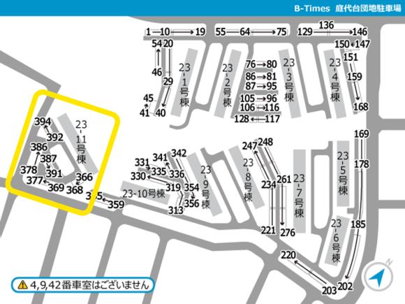 ■近隣に似た名前の団地がありますが、当駐車場は【庭代台団地】の駐車場となっております。お間違えないようにご注意ください。 ■団地内に一方通行がある場合は必ず守って走行してください。 ■現地に到着した際は、必ずタイムズのBの写真や配置図をご確認の上、駐車してください。 間違って他の利用者の場所に駐車しないよう、お気を付けください。 ■団地内駐車場となりますので、アイドリング・喫煙・ポイ捨てはご遠慮くださ い <ご予約した区画に不正車両が止まっていた場合> 下記をご参照の上、空き車室の照会・振替および不正駐車情報のご入力をお願いいたします。 https://btimes.jp/guide/rent_illegalpark.html |