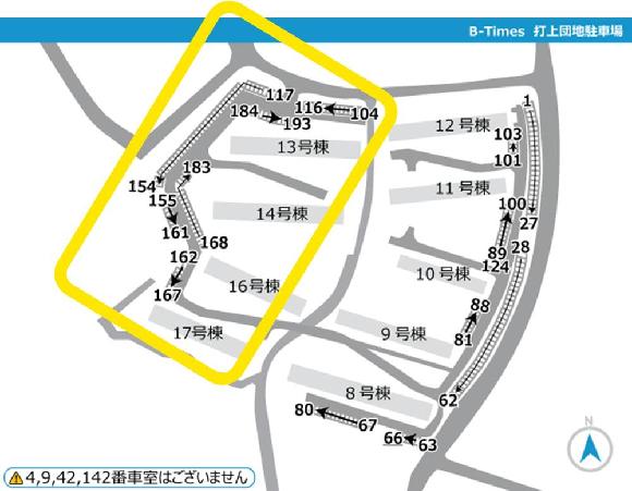 ■団地内に一方通行がある場合は必ず守って走行してください。 ■現地に到着した際は、必ずタイムズのBの写真や配置図をご確認の上、駐車してください。間違って他の利用者の場所に駐車しないよう、お気を付けください。※現地に記載されている番号が見えにくい場合もございます。 ■団地内駐車場となりますので、アイドリング・喫煙・ポイ捨てはご遠慮くださ い <ご予約した区画に不正車両が止まっていた場合> 下記をご参照の上、空き車室の照会・振替および不正駐車情報のご入力をお願いいたします。 https://btimes.jp/guide/rent_illegalpark.html |