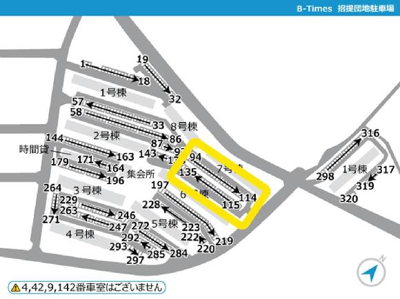 ■近隣に似た名前の団地がありますが、当駐車場は【招提団地】の駐車場となっております。お間違えないようにご注意ください。 ■団地内に一方通行がある場合は必ず守って走行してください。 ■現地に到着した際は、必ずタイムズのBの写真や配置図をご確認の上、駐車してください。間違って他の利用者の場所に駐車しないよう、お気を付けください。 ■団地内駐車場となりますので、アイドリング・喫煙・ポイ捨てはご遠慮くださ い <ご予約した区画に不正車両が止まっていた場合> 下記をご参照の上、空き車室の照会・振替および不正駐車情報のご入力をお願いいたします。 https://btimes.jp/guide/rent_illegalpark.html |
