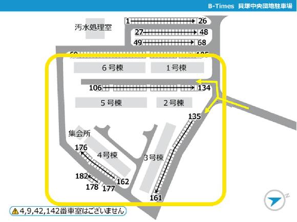 ■ナビの場合は「貝塚市橋本1060-5」の住所を登録して頂くと、団地入口付近までたどり着けます。※ナビによっては登録されていないケースもございます。 ■団地内に一方通行がある場合は必ず守って走行してください。 ■現地に到着した際は、必ずタイムズのBの写真や配置図をご確認の上、駐車してください。間違って他の利用者の場所に駐車しないよう、お気を付けください。 ■団地内駐車場となりますので、アイドリング・喫煙・ポイ捨てはご遠慮くださ い <ご予約した区画に不正車両が止まっていた場合> 下記をご参照の上、空き車室の照会・振替および不正駐車情報のご入力をお願いいたします。 https://btimes.jp/guide/rent_illegalpark.html |