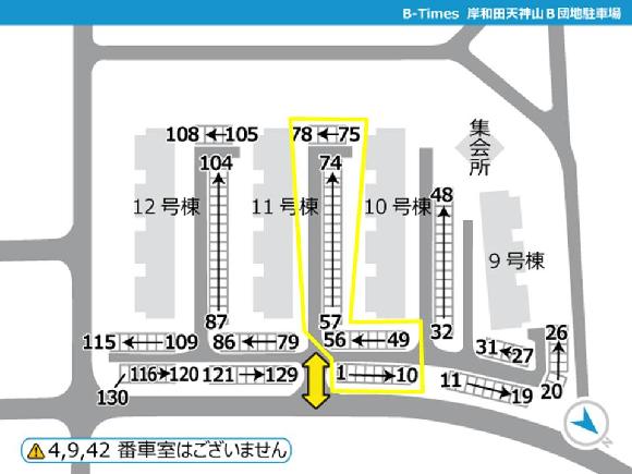 ■団地内に一方通行がある場合は必ず守って走行してください。 ■現地に到着した際は、必ずタイムズのBの写真や配置図をご確認の上、駐車してください。間違って他の利用者の場所に駐車しないよう、お気を付けください。 ■団地内駐車場となりますので、アイドリング・喫煙・ポイ捨てはご遠慮くださ い <ご予約した区画に不正車両が止まっていた場合> 下記をご参照の上、空き車室の照会・振替および不正駐車情報のご入力をお願いいたします。 https://btimes.jp/guide/rent_illegalpark.html |