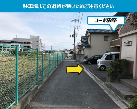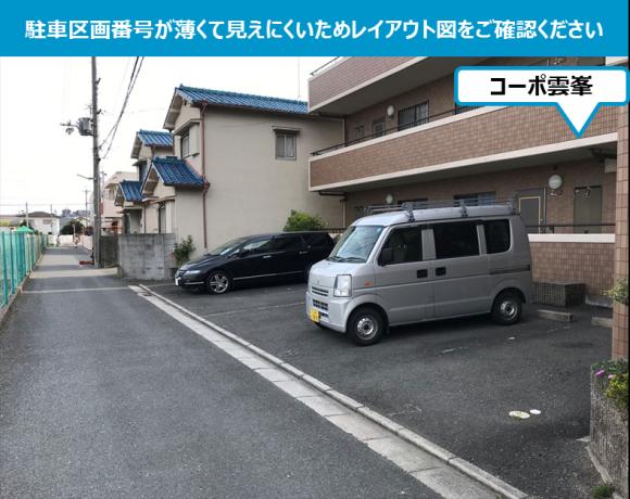 ※駐車場までの道路が狭いため、小型車と軽自動車での利用を推奨いたします。 【駐車場へのご案内】 ●「コーポ雲峯」前の駐車区画です。駐車場前の道路が非常に狭いため、駐車の際にはご注意ください。 ●カーナビ等でピンポイントに指定されない場合は、「GoogleMapsで見る」のボタンから正しい位置をご確認ください。 【駐車の際にはご注意ください】 ●車室番号が薄く見えづらくなっているため、レイアウト図をご確認の上で指定場所にお停めください。 ●周辺は住宅地ですので、アイドリング、夜間のドア開閉などに配慮をお願いします。 |