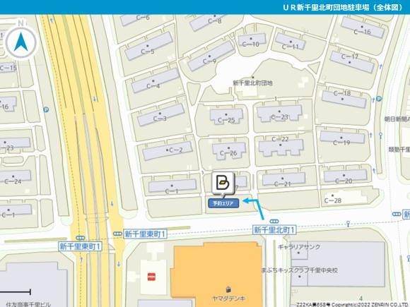 新千里北町の団地内にある駐車場です。千里中央駅まで徒歩約6分!駅周辺には病院や商業施設があり、御用がある際にはおすすめです!