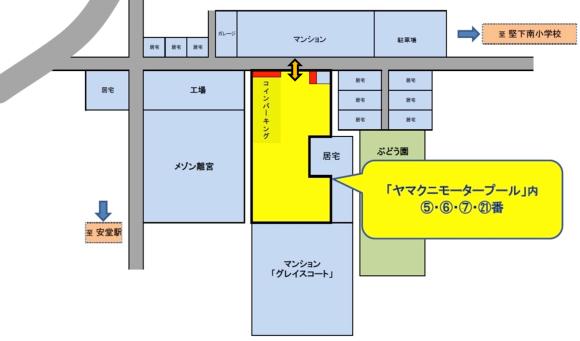 大阪府柏原市安堂町6-35の東隣り「ヤマクニモータープール」敷地内(Google Maps) ※住所をナビに入れても正しく表示されない場合があります。 |