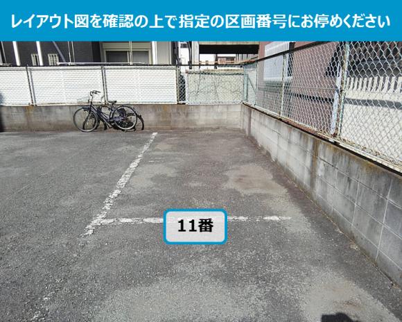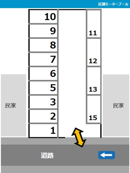 【駐車場へのご案内】 ※月極駐車場「近藤モータープール」内です。 ※駐車場前面道路は西向き一方通行です。 【駐車の際にはご注意ください】 ※1番から10番は西側区画、11番から15番は東側の縦列駐車区画です。 ※周辺住宅のご迷惑にならないよう、アイドリングストップにご協力をお願いします。 |