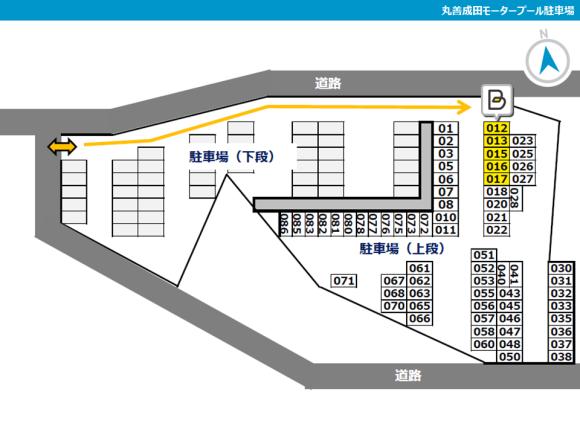 【駐車場へのご案内】 ※月極駐車場「丸善成田モータープール」の上側エリアです。 ※入口からそのまま真っ直ぐ(東向き)に進んで突きあたりが上側エリアです。 【駐車の際にはご注意ください】 ※非常に広い駐車場のため、事前に指定の駐車場所を確認の上でお越しください。 ※区画線と区画番号が薄くて見えづらいため、注意してお停めください。5枚目写真のレイアウト図を参考に指定された場所にお停めください。 ※周辺はマンション住宅ですので、アイドリング、夜間のドア開閉などに配慮をお願いします。 |