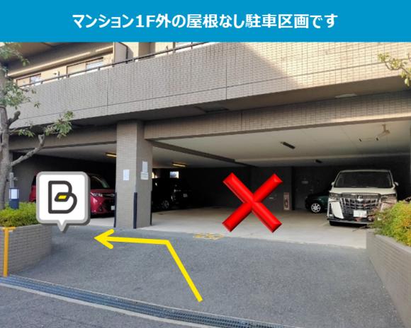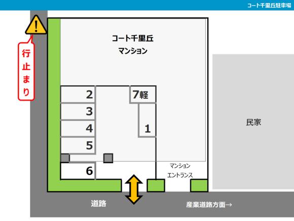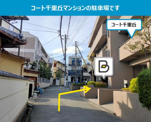 【駐車場へのご案内】 ※マンション「コート千里丘」の駐車場内です。 ※マンション前の屋根なし部分の駐車区画です。 【駐車の際にはご注意ください】 ※柱や壁に注意してお停めください。 ※周辺は住宅地ですので、アイドリング、夜間のドア開閉などに配慮をお願いします。 |