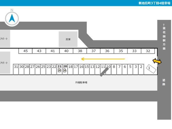【駐車場へのご案内】 ※月極駐車場「仲村造園駐車場」内の区画です。 ※カーナビ等の設定では「大阪府東大阪市新池島町3丁目4-8」にセットすると出入口付近に案内されます。 ※南隣りにも月極駐車場がありますので、お間違えないようにご注意ください。 【駐車の際にはご注意ください】 ※駐車場情報のレイアウト図と写真を確認の上で指定場所にお停め下さい。 ※駐車すると車が北向きになる駐車場です。 ※アイドリングストップにご協力をお願いします。 |