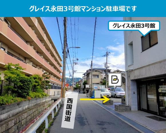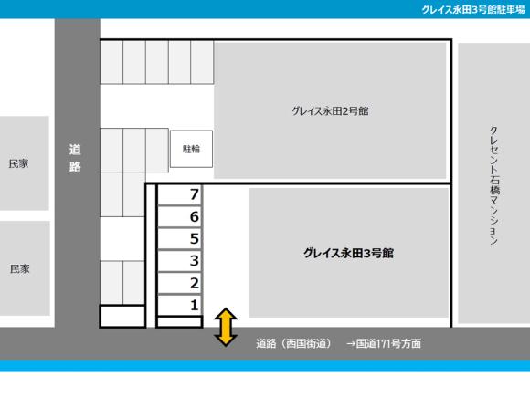 ※駐車場の区画幅が2.3mと少々狭いため、車幅1.8m以下のご予約をお勧めします。 【駐車場へのご案内】 ※グレイス永田3号館マンション北側の駐車場です。 ※駐車場周辺の道路が狭い場所がありますので、注意してお越しください。 【駐車の際にはご注意下さい】 ※予約確認メールに記載された区画番号にお停めください。 ※周辺が住宅地のため、夜間のアイドリングストップにご協力をお願い致します。 |