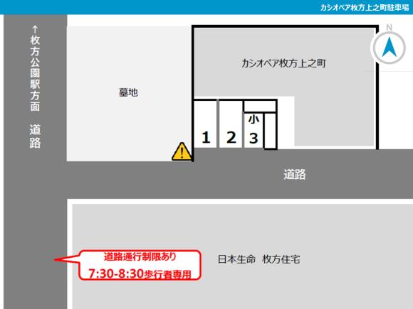 【駐車場へのご案内】 ※カシオペア枚方上之町マンション前(建物の南側)の駐車場です。 ※周辺道路に通行制限(歩行者専用7:30-8:30)がある道路があります。 【駐車の際にはご注意ください】 ※指定区画以外には月極契約者がいますので、必ず指定区画を確認してお停めください。 ※周辺住宅のご迷惑にならないよう、アイドリングストップにご協力をお願いします。 |