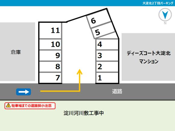 ※淀川堤防の南側一方通行道路沿いです。 【駐車場へのご案内】 ※月極駐車場「大淀北2丁目パーキング」内です。 ※駐車場までの道路が狭い一方通行道路のためご注意ください。 【駐車の際にはご注意ください】 ※レイアウト図を参考に予約確認メールに記載された区画場所にお停めください。 ※隣りにマンションがありますので、アイドリング、夜間のドア開閉などに配慮をお願いします。 |