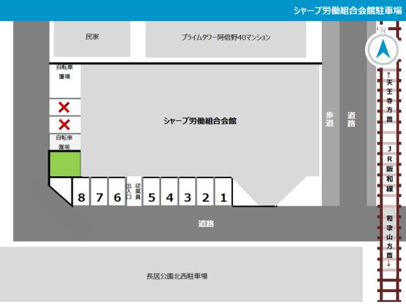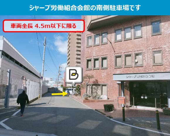 ※全長4.5m以下の車両のみ利用可能 ※土日祝日専用 【駐車場へのご案内】 ※「シャープ労働組合会館」前(建物の南側)の駐車場です。 【駐車の際にはご注意ください】 ※駐車区画には車止めがないため注意してお停めください。 ※周辺住宅のご迷惑にならないよう、アイドリングストップにご協力をお願いします。 |