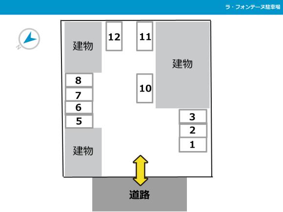 【駐車場へのご案内】 ※「ラ・フォンテーヌ」の駐車場です。 ※駐車場周辺の道路が狭いため、十分に注意してお越ししください。 【駐車の際にはご注意ください】 ※駐車区画の番号が薄くて見えづらい可能性がありますので、レイアウト図を参考に予約確認メールに記載された区画場所にお停めください。 ※周辺は住宅地ですので、アイドリング、夜間のドア開閉などに配慮をお願いします。 |