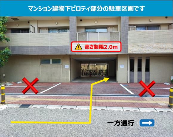 ※高さ制限(2.0m)あり。駐車される車両の高さをご確認の上で予約をお願いします。 【駐車場へのご案内】 ※ヴィラ・ソレーユ高槻町マンションの建物下ピロティ部分駐車場です。 ※駐車場出入口はマンションの西側です。 【駐車の際にはご注意ください】 ※現地の駐車区画番号と、駐車場情報のレイアウト図を参考に予約確認メールに記載された区画場所にお停めください。 ※周辺は住宅地ですので、アイドリング、夜間のドア開閉などに配慮をお願いします。 |