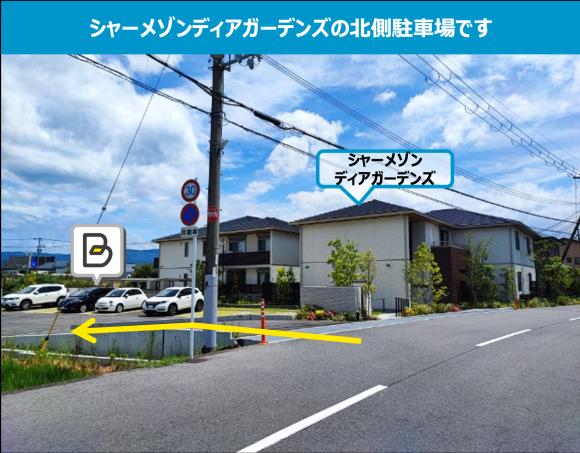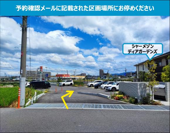 【駐車場へのご案内】 ※「シャーメゾン ディアガーデンズ」敷地内(建物の北側)の駐車場です。 【駐車の際にはご注意ください】 ※レイアウト図を参考に予約確認メールに記載された区画場所にお停めください。 ※周辺は住宅地ですので、アイドリング、夜間のドア開閉などに配慮をお願いします。 |