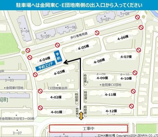 【駐車場へのご案内】 ※大阪府住宅供給公社 金岡東C・E団地内の駐車場です。 ※団地の駐車場で入口は南側1ヶ所です。カーナビには「大阪府堺市北区4丁4-1」で登録すると出入口付近が案内されます。 ※GoogleMAPの位置情報も参考にお越しください。 【駐車の際にはご注意ください】 ※団地駐車場が非常に広いため、事前に駐車位置(指定区画番号)を確認の上でお越しください。 ※現地の車室番号とレイアウト図をご確認の上でお停めください。 ※団地内駐車場となりますので、アイドリング・喫煙・ポイ捨てはご遠慮ください。 ※両隣の月極契約車両の兼ね合いがあり、車幅180cmまでの車両での予約をお願い致します。 <ご予約した区画に不正車両が止まっていた場合>下記をご参照の上、空き車室の照会・振替および不正駐車情報のご入力をお願いいたします。https://btimes.jp/guide/rent_illegalpark.html |
