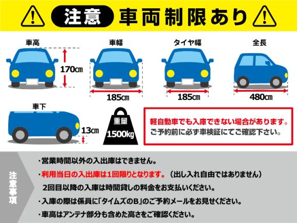 ※ビックカメラ・エディオン等の提携サービスとの併用は出来ません。 ※人気駐車場の為、現地の時間貸し料金より高い場合があります。 ■宿泊不可!! ■当日の再入庫 ・複数回入出庫はできません、2回目以降は一般車両の料金をお支払い下さい ■ハイルーフ車は入庫不可 ■万が一、車室制限によって駐車できなかった場合、現地駐車場およびタイムズのBでは返金不可となります。 ■駐車場に着いたら、「タイムズのBで予約済み」であることを駐車場係員に伝え、予約完了メール、もしくは予約画面を駐車場係員にご提示ください ■駐車場の利用可能時間外は入出庫は不可です。時間外に駐車される場合は別途料金が発生しますので、出庫の際に現地にてお支払ください。 ■21時以降は、翌営業開始まで出庫不可 ■ドアミラーの格納可能です |