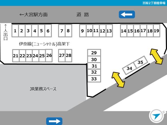 ※高架下の駐車場のため、本ページ記載の住所で検索しても、カーナビ等で正しく表示されない場合があります。 ※現地に記載の番号・区画線が見えづらい場合があります。掲載の配置図を参考に、お間違いのないように駐車してください。 ※駐車場内の橋脚に注意して、ご利用ください。 |