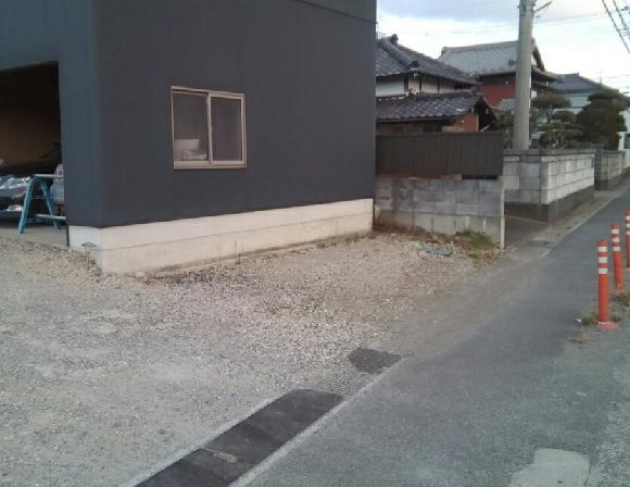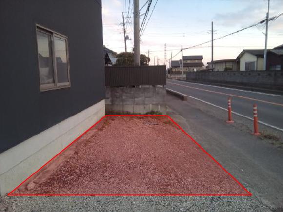 画像の通り縁石等はございません。 車道側のポールまで入れると横幅は4m以上です。 画像の通りですので大きい車両もバックから 非常に車庫入れしやすくなっております。 |