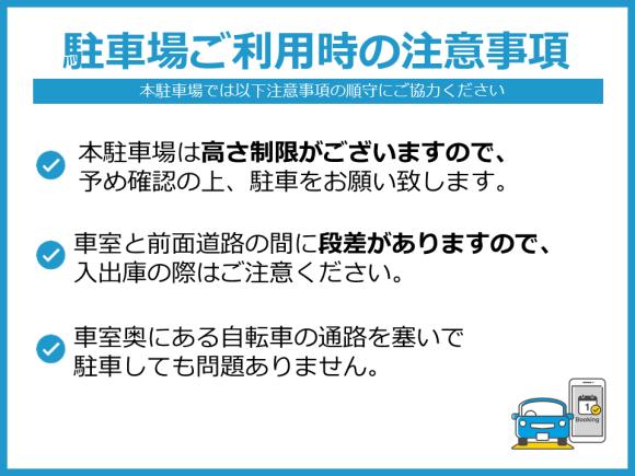 ※入口に段差スロープを設置しました。 ※奥に自転車(処分予定)がありますが、自転車の通路を塞いでも問題ありません。 ※横幅等、ご確認の上ご利用ください。 ※車室と前面道路の間に段差がありますので、入出庫の際は十分お気を付け下さい。 |