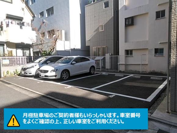・月極駐車場内の車室になります。月極後契約者の方もいらっしゃいますので、現地の車室番号と予約車室をよくご確認の上、お間違えのないようご利用ください。 ・駐車場内でのアイドリングは東京都の条例により禁止されておりますので、絶対になさらないようにお願いいたします。 |