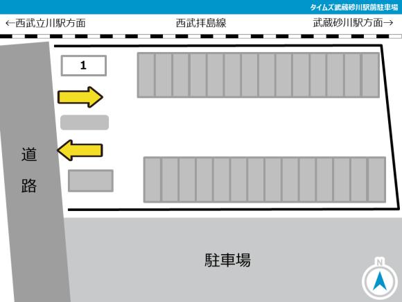 ■タイムズ武蔵砂川駅前(時間貸し駐車場)と同一敷地内です。 ■時間貸しの駐車スペースをご利用された場合、ご返金はできかねますのご注意ください。 ■ご利用いただく駐車場の住所で検索しても、ナビや地図アプリでは正しく表示されない場合がございます。 住所下にある「GoogleMAPで見る」のボタンを押して頂くと正しい場所が表示されます。 ■現地に到着した際は、必ずタイムズのBの写真や配置図をご確認の上、駐車してください。 間違って他の利用者の場所に駐車しないよう、お気を付けください。 ※現地には番号が振られていないケースもございます。 |