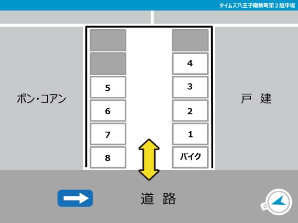 ■タイムズ八王子南新町第2駐車場(時間貸し駐車場)と同一敷地内です。 ■時間貸しの駐車スペースをご利用された場合、ご返金はできかねますのご注意ください。 ■ご利用いただく駐車場の住所で検索しても、ナビや地図アプリでは正しく表示されない場合がございます。 住所下にある「GoogleMAPで見る」のボタンを押して頂くと正しい場所が表示されます。 ■現地に到着した際は、必ずタイムズのBの写真や配置図をご確認の上、駐車してください。 間違って他の利用者の場所に駐車しないよう、お気を付けください。 ※現地には番号が振られていないケースもございます。 |