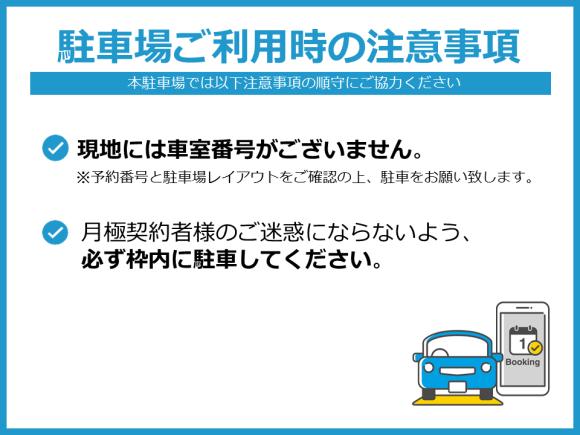 ■月極契約者がいるため、必ず枠内に駐車してください。 ■現地には車室番号の記載がありません。予約車室番号と駐車場レイアウトをご確認の上、駐車をお願い致します。 |
