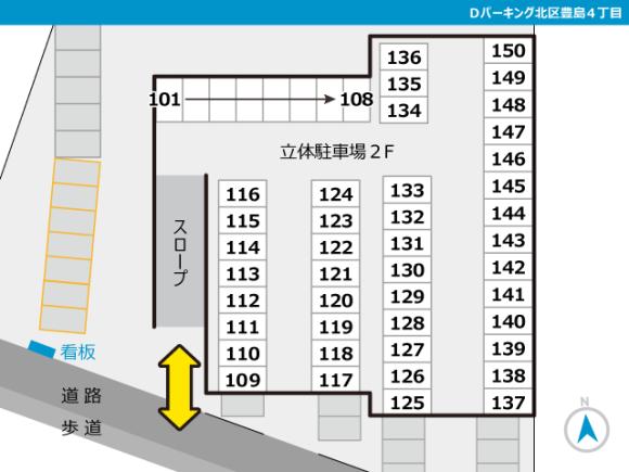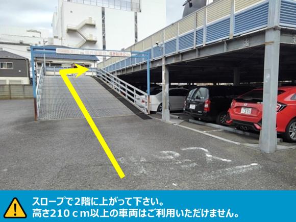 ※高さ210cm以上の車両はご利用いただけません。 ※ご予約の対象区画はスロープを上がり2階になります。 ※webサイト上のレイアウト及び現地の車室番号をご確認の上、必ず指定の区画に駐車して下さい。 |