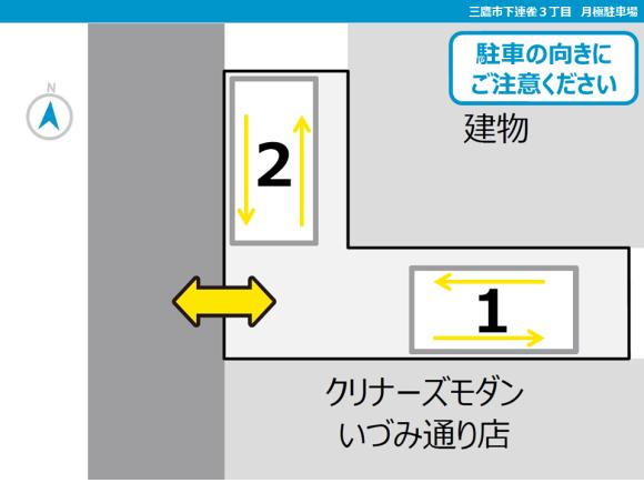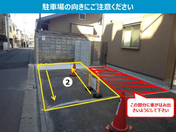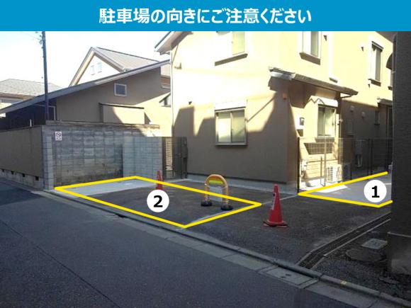 ■現地に到着した際は、必ず写真や配置図をご確認の上、駐車してください。 車を止める向きにご注意ください。 特に2番はご注意ください。道路に対して並行に駐車してください。 間違って他の利用者の場所に駐車しないよう、お気を付けください。 ※現地には番号が振られておりません。 |