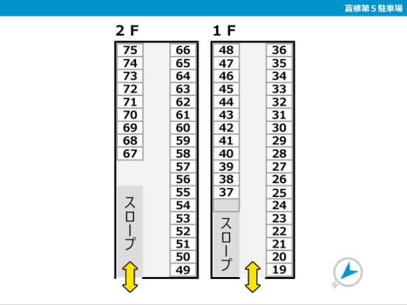 ※49番から75番をご予約の方は、スロープを上って2階をご利用ください。 ■ご利用いただく駐車場の住所で検索しても、ナビや地図アプリでは正しく表示されない場合がございます。 住所下にある「GoogleMAPで見る」のボタンを押して頂くと正しい場所が表示されます。 ■現地に到着した際は、必ずタイムズのBの写真や配置図をご確認の上、駐車してください。 間違って他の利用者の場所に駐車しないよう、お気を付けください。 ※現地には番号が振られていないケースもございます。 |