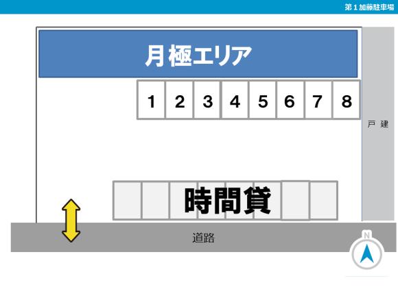 ※現地の番号が見えづらい場合があります。掲載の配置図を参考に、お間違いのないようにご利用ください。 ※当駐車場の前面道路は「7:30-9:00」の間スクールゾーンとなります。入出庫時間にご注意ください。 |
