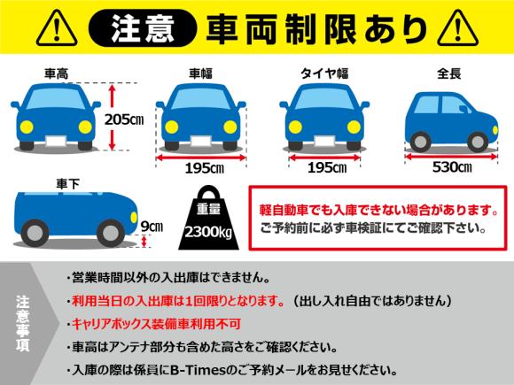 ※軽貨物車両、事業用車両(黒ナンバー、緑ナンバー等)でのご入庫はできません