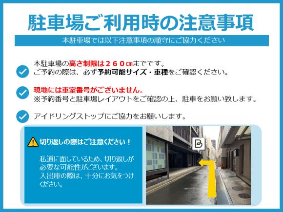 ※本駐車場の高さ制限がございます。ご予約の際は、必ず予約可能サイズ・車種をご確認ください。 ※現地には車室番号がございません。 予約番号と駐車場レイアウトをご確認の上、駐車をお願い致します。 ※アイドリングストップにご協力をお願いします。 ※私道に面しているため、切り返しが必要な可能性がございます。 入出庫の際は、十分にお気をつけください。 |