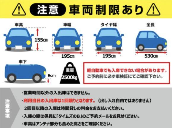 ▽予約前▽ ◆車両制限 ・実際の車両サイズを必ずご確認の上ご予約ください。 ※車検証に記載のサイズは実寸と異なる場合があります。 ・改造車は車両制限内でも入庫できない可能性があります。ご予約はお控え下さい。 ・上記理由などで入庫できなかった場合、料金の返金はできません。 ◆入出庫可能時間 営業時間の平日7:00-22:00、土曜日7:00-20:00のみ入出庫可能です。 営業時間外、日曜祝日はお休みですので入出庫はできません。 ◆利用当日は、営業時間内であれば、再入庫・複数回入出庫は可能となっております。 ◆車両のナンバーで予約を管理しているため、予約時にナンバー入力が必須です。 ▽利用時▽ ◆入庫方法 ・予約済みであることを駐車場係員に伝え、予約完了メールか予約画面を提示下さい。 ◆出庫方法 ・係員の指示に従い出庫下さい。 ◆宿泊利用 予約時間を超えて宿泊駐車をする場合、現地で別途宿泊料金 1,000円(税込) を現地係員へお支払いください。 ※時間外は入出庫できません。 ※22:00(土曜日20:00)には駐車場入り口が閉まりますので、それまでにお戻りください。 提携店舗の割引等は利用できません。 ▽その他▽ ペット同伴で駐車場内、KABUTO ONEビル内には入れません |