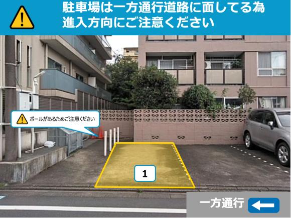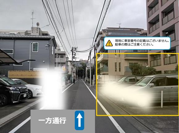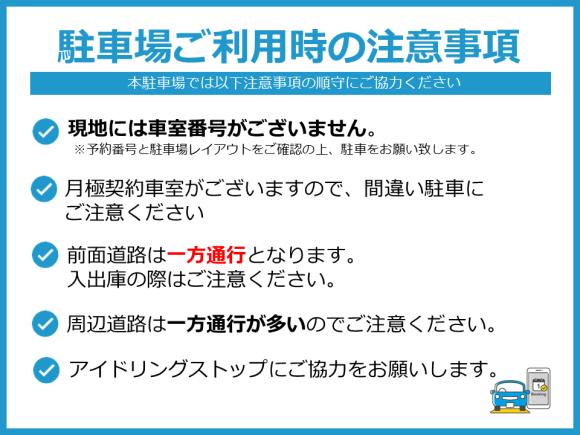 ※現地に車室番号の記載はございません。 WEB上に掲載されているレイアウトを確認いただき、正しい番号箇所に 駐車してください。 ※前面道路が、一方通行となりますので入出庫の際はご注意ください。 ※アイドリングや騒音などにご配慮くださいますようご協力お願いします。 |