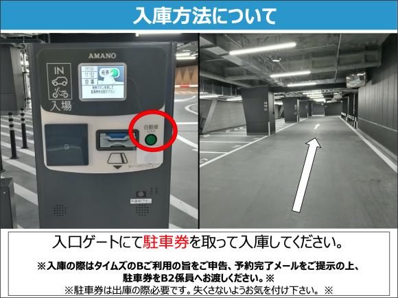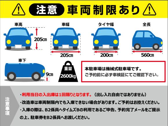 ・本予約ページは機械式駐車場ご利用専用です。 ・駐車場営業時間は7時から22時です。営業時間外の入出庫は出来かねます。 ・連泊ご希望の方は出庫日当日までのご予約をお願いいたします。 ・駐車券を発券しご入場ください。 ・入庫の際は、B2係員へタイムズBの利用であるご申告、予約完了メールをご提示の上、駐車券をB2係員へお渡しください。 ・利用当日の入出庫は1回限りとなります。 (出し入れ自由ではありません) |
