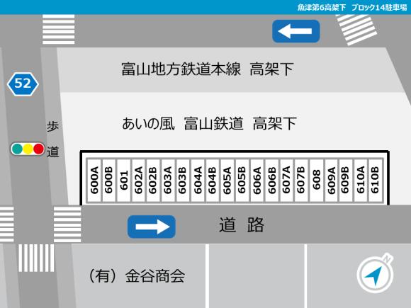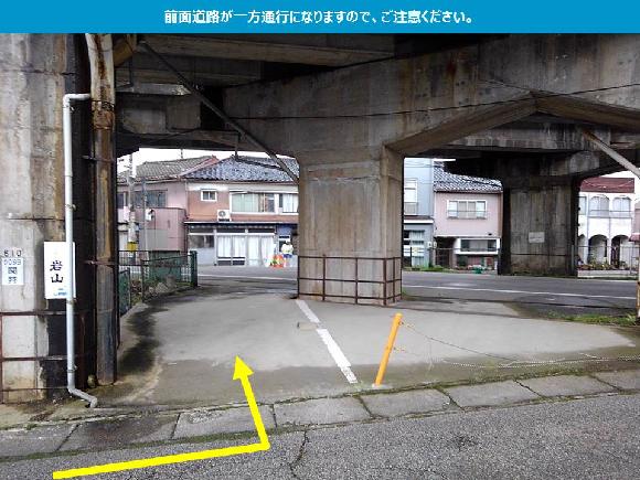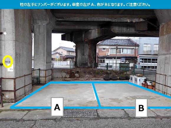 ■あいの風とやま鉄道高架下の駐車場です。レイアウト図と柱番号を目印にお越しください。 ■必ず、予約時に指定された車室番号にお停め下さい。 ■周辺は住宅地のため、アイドリングや騒音、夜間のドア開閉などに、ご配慮、ご協力をよろしくお願いいたします。 1.高架橋は雨から車両を守る屋根ではありません。雨が高架上より降込む場合や砂の混じった濁った水が車両に流れ落ちる事があります。ご承知のうえご利用ください。 2.駐車場内における盗難、破損、紛失、焼失、冠水、野生動物による糞尿被害など事故にかかる損害は、あいの風とやま鉄道(株)は一切の責を負いません。 |